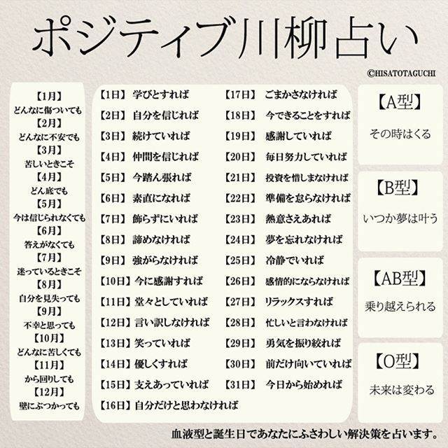 すぐやる8か条 や あかさたなはまやらわの法則 などの本の著者として有名な田口久人さんが作成した血液型と誕生日で自分に最適な前向きな言葉がわかる ポシティブ占い が話題になっています 前向き 言葉 ポジティブ